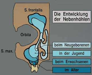 Die Ausdehnung der Nasen-Nebenhöhlen ist mit der Geburt nicht abgeschlossen. Für die Klinik ist die weitere Entwicklung von Interesse: z. B. Stirn- und Keilbeinhöhlen: