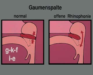 Normaler Gaumen: Anheben des Velums und vollständige Trennung von Mund- und Rachenraum: beiVerschluss- und Reibelaute z.B. g, k, f sowie bei den Vokalen i und e Kinder mit einer Gaumenspalte: Offene Rhinophonie | ||||
