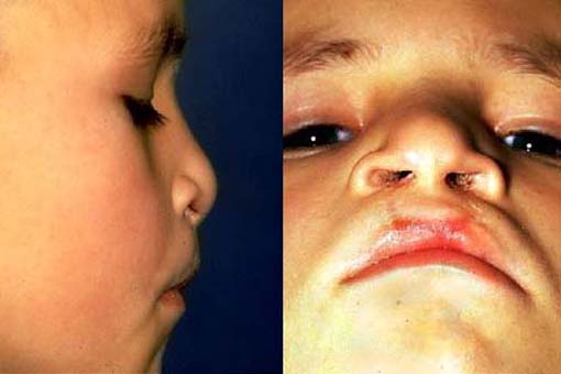 Doppelseitige Lippen-Kiefer-Gaumenspalte: nach unten gezogene Nasenspitze, hypoplastische Nasenflügel und querstehende Nasenlöcher.