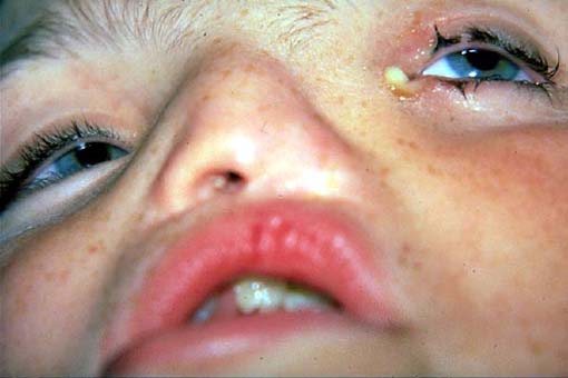 Verschluss des linken äusseren Naseneingangs. Eiterpünktchen und Ekzem im inneren Augenwinkel weisen auf Verschluss der nasalen Öffnung der Tränenwege hin.