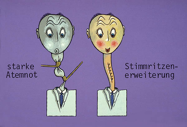 Die doppelseitige Recurrensparese verläuft dramatisch, denn sie führt zu starker Atemnot. Bei durchtrennten Nerven bzw. im Spätstadium einer Lähmung besteht kaum mehr Aussicht auf eine Restitutio. Hier wird die operative Stimmritzenerweiterung vorgenommen. Man verhindert damit, dass die Patienten Dauerkanülenträger werden.