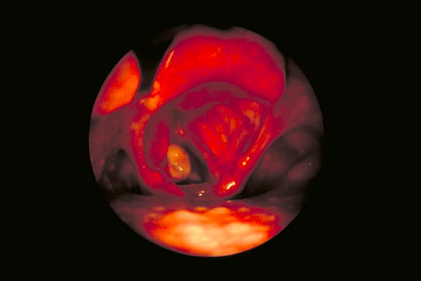 Weitere Folgen von Entzündungen und falschem Stimmgebrauch sind Polypen, Zysten, Knötchen und die Intubationsgranulome. Hier ein Stimmbandpolyp.