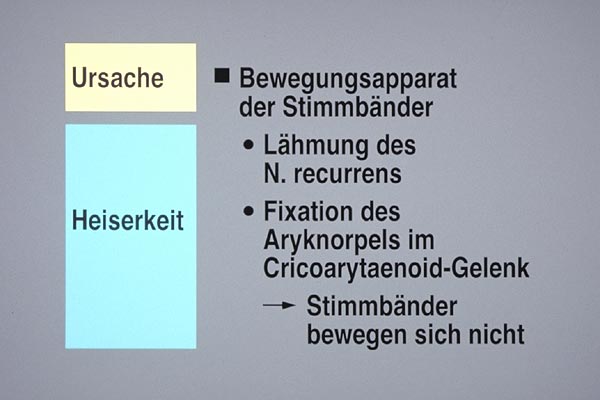 Bewegen sich eines oder beide Stimmbänder nicht, liegt entweder eine Rekurrenslähmung vor, oder die Unbeweglichkeit des Stimmbandes ist bedingt durch eine Fixation des Aryknorpels im Cricoarythaenoidgelenk.