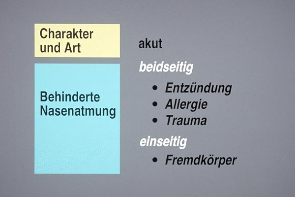 Eine akut einsetzende Behinderung der Nasenatmung kann entzündlicher Natur sein. Für eine allergische Reaktion ist sie geradezu typisch. Wir finden sie auch als Reaktion nach einem Trauma. In allen drei Fällen tritt sie doppelseitig auf.