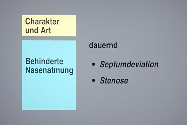 Die erschwerte Nasenatmung ist bei einer Septumdeviation sowie bei einer Stenose dauernd vorhanden. Abhängig vom Schwellungszustand der Schleimhaut ist die erschwerte Nasenatmung mehr oder weniger störend. Bei gewissen Formen der vasomotorischen Rhinopathie, z.B. bei der medikamentösen Form, kann die Behinderung auch dauernd vorhanden sein.