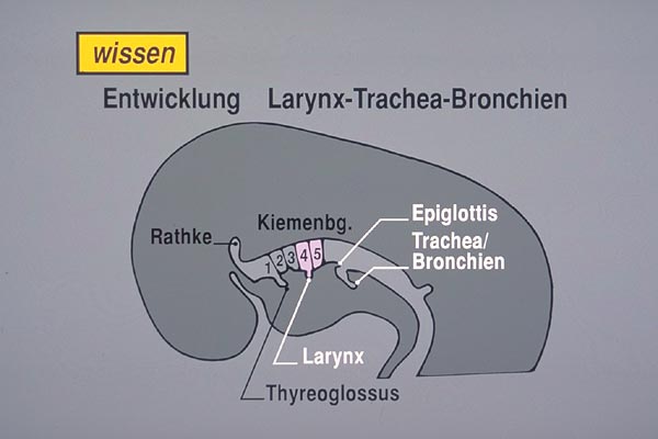 Das Larynxgerüst entwickelt sich aus dem 4. und 5. Kiemenbogen. trachea und Bronchien hingegen entstehen aus einer Ausbuchtung des primitiven Darms. Larynx und Trachea schliessen sich sekundär zusammen. Zu Beginn ist der Larynx eine kompakte epitheliale Masse, die sich sekundär kanalisiert.